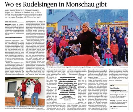 ... am Donnerstag, den 18.12.25 um 16:30 Uhr beim FC 21 (noch Helfer gesucht) und am Sonntag, den 21.12.25 um 16:00 Uhr am Bahnhof Monschau.
